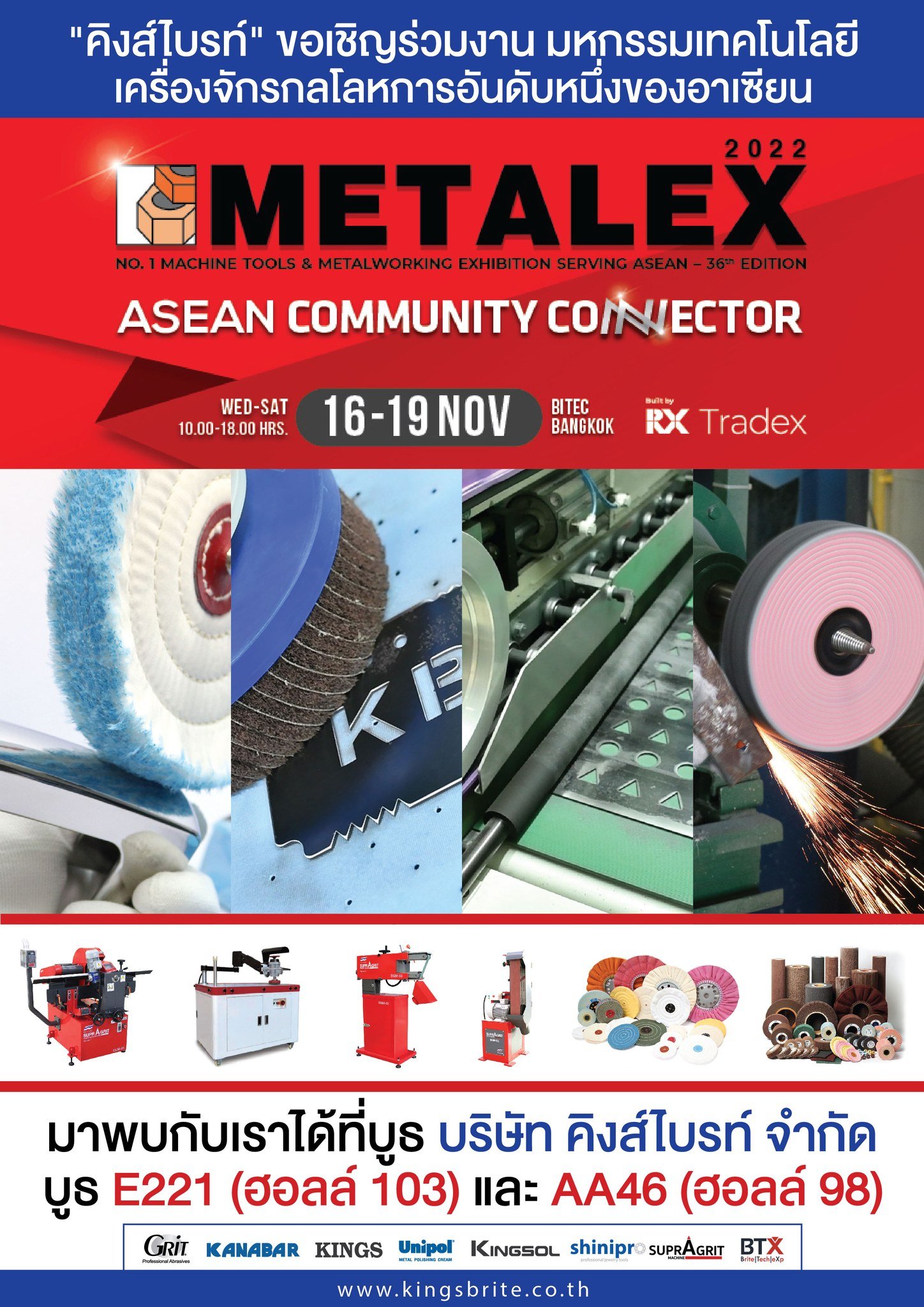 คิงส์ไบรท์จัดเต็ม มาพร้อมสินค้าเกี่ยวกับ อุปกรณ์ เครื่องมือ เครื่องจักร ด้านงานขัดโลหะครบวงจร และ โปรโมชั่น ราคาพิเศษ เฉพาะในงานเท่านั้น!! ไม่ควรพลาด!!
