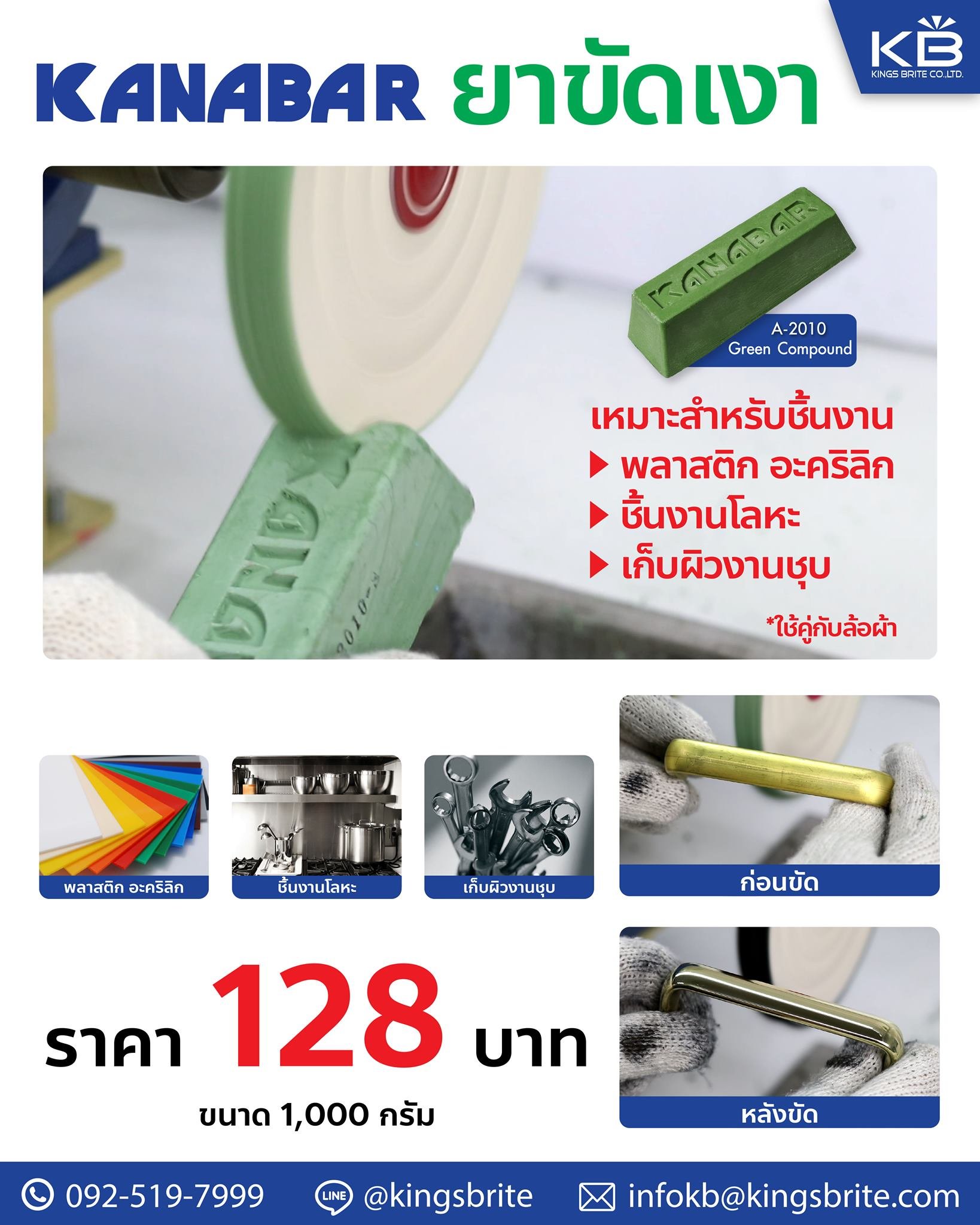 ใครที่มองหายาขัดเงา สำหรับขัดงานพลาสติก อะคริลิก งานโลหะ - อโลหะ งานชุบต่าง ๆ ต้องจัดตัวนี้เลยค่ะ KANABAR ยาขัดเงา "สีเขียว" A-2010 การันตีผลลัพธ์ด้านความเงาใส ทำให้ชิ้นงานดูผุดผ่อง เงางาม แบบไร้ที่ติ ชมคลิปสาธิตงานขัดเงายาขัดก้อนสีเขียว