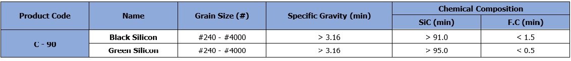 Black or Green in color. Black in mast common. Hard and sharp, Which makes it the ideal abrasive for use on non-ferrous metals such as Aluminium, Brass, Bronze, Magnesium, and titanium, and also non-metallic materials such as rubber, glass, plastic, fibrous wood, and other soft material.